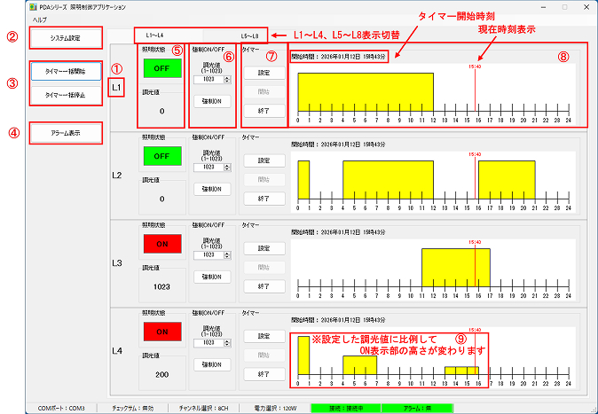 - 開始でL1~L8の各々の照明制御を開始します。