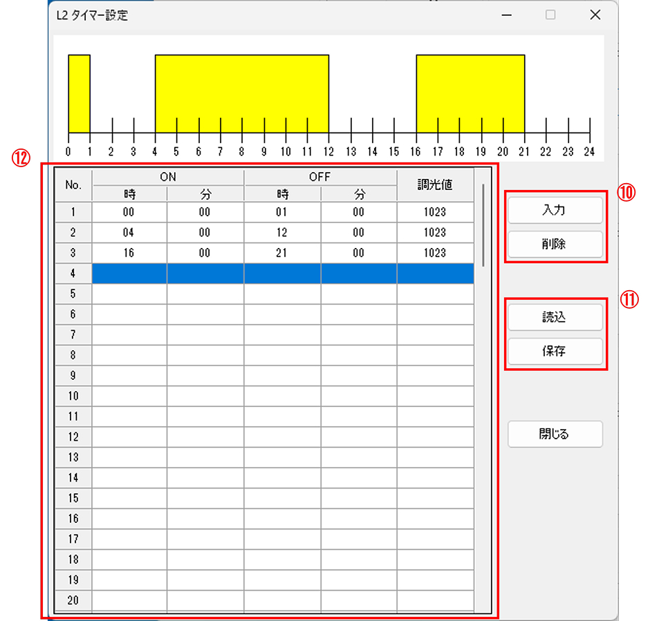 - 入力で24HタイマーのON/OFF時刻の設定と調光値の設定を行えます。